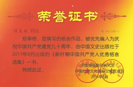 黃山良業(yè)閥門有限公司董事長、黨支部書記項美根同志,是一名有70歲年齡,35年黨齡的老黨員。最近,用他一身經(jīng)歷、體驗、實踐而撰寫的格言作品,被優(yōu)先編入為慶祝中國共產(chǎn)黨建黨成立90周年,由中國文史出版社于2011年8月出版的《新是期中國共產(chǎn)黨人優(yōu)秀格言選集》一書。